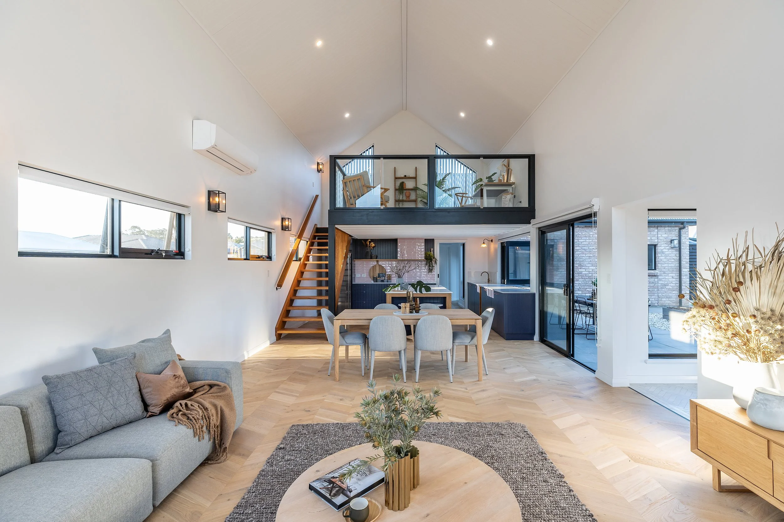 Striking architectural detail: Featuring dramatic 5.5m raked ceilings clad in sophisticated V-groove panelling, and a breathtaking 6m-high double brick chimney anchoring the central pavilion